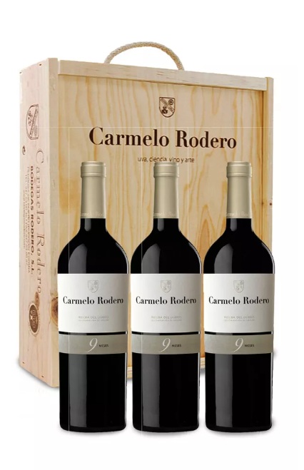Estuche Vino Carmelo Rodero 9 meses 3 botellas, es una presentación de uno de los tintos de referencia de Bodegas Rodero, ideal para conocer la esencia de la Ribera del Duero con un toque de crianza.